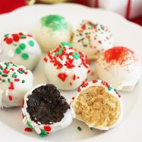 • Melt white chocolate according to package directions. Dip the balls into chocolate, place on the baking sheet, and immediately top with sprinkles or desired decorations. (I find a wooden skewer helps with the dipping! Just stick into the truffle, swirl in the chocolate, and place on the sheet).