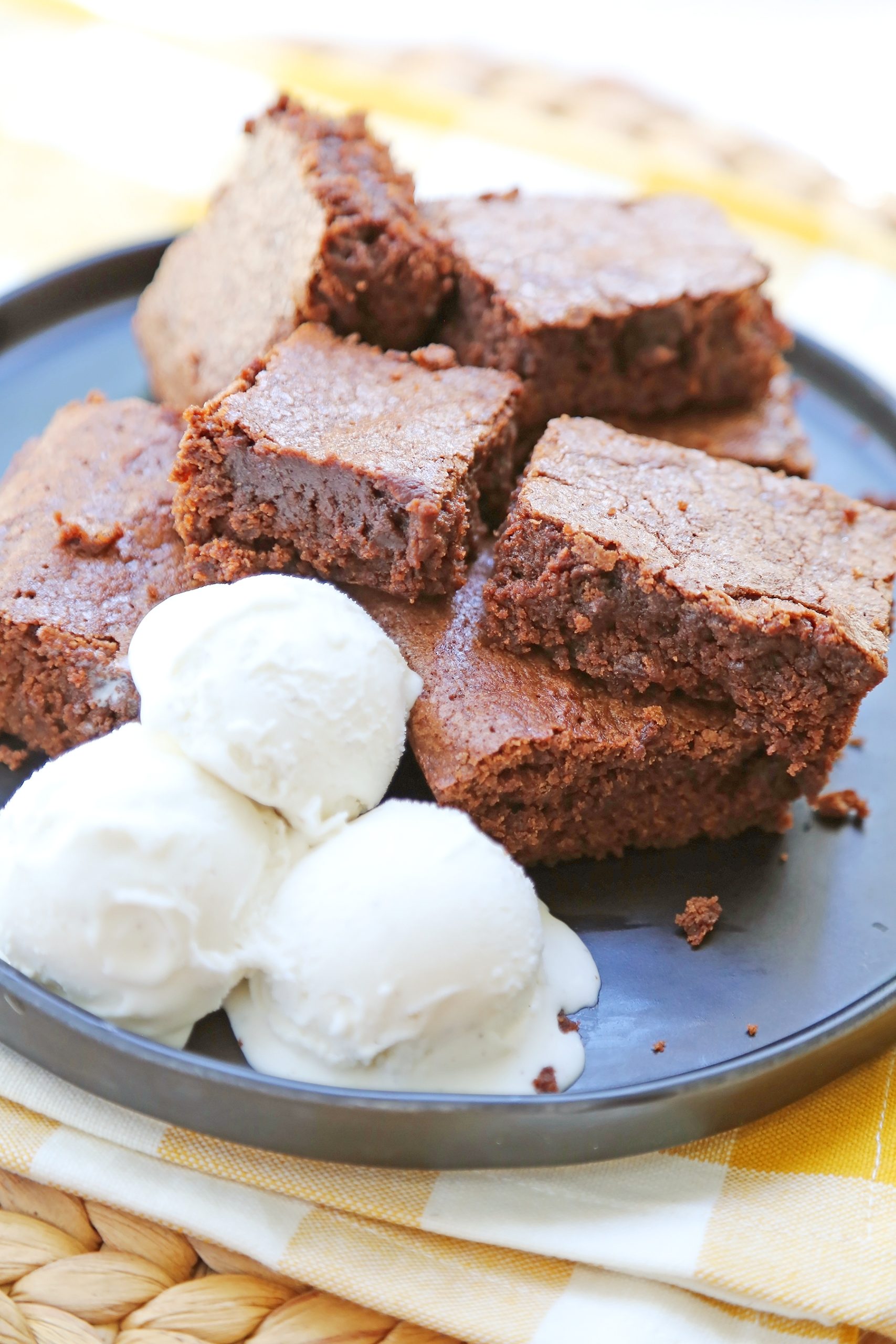 Buttery soft, fudgy chocolate brownies made in under 10 minutes! Just one bowl and a handful of pantry staples to the BEST brownie ever. These are constantly requested by friends and family – everyone loves them. Add your favorite mix-ins like nuts, marshmallows or chocolate chips. Amazing with vanilla ice cream!