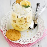 Banana pudding is a Southern specialty of sweet, creamy vanilla custard layered with sliced bananas and, typically, Nilla Wafers. And, oh my stars, who doesn’t feel like a kid again when eating those wafers. But I wanted to jazz up these tasty little trifles with something different – Walker’s Shortbread Lemon Thins.