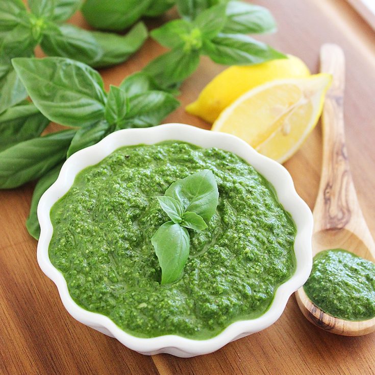 Got bunches of fresh basil? Whip up a spinach-basil pesto! It’s easy, nut-free and pairs perfectly with grilled meats and veggies, sandwiches, and pastas!