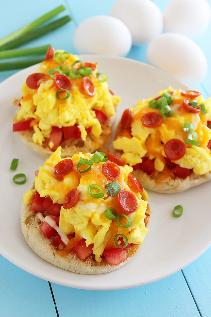 - Toast English muffins and spread with butter. Top with chopped tomato, scrambled eggs, shredded cheese, and mini pepperoni. Place on a baking sheet.