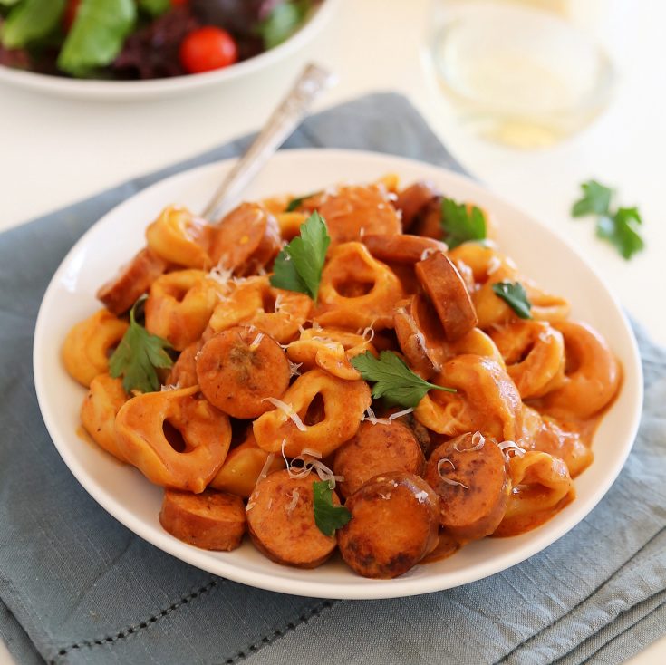 Soft tortellini and smoky sausage smothered in a creamy tomato sauce make this 7-ingredient skillet meal one of our faves! So easy, quick and delicious for weeknight dinners. Just sprinkle with Parmesan and add a salad!