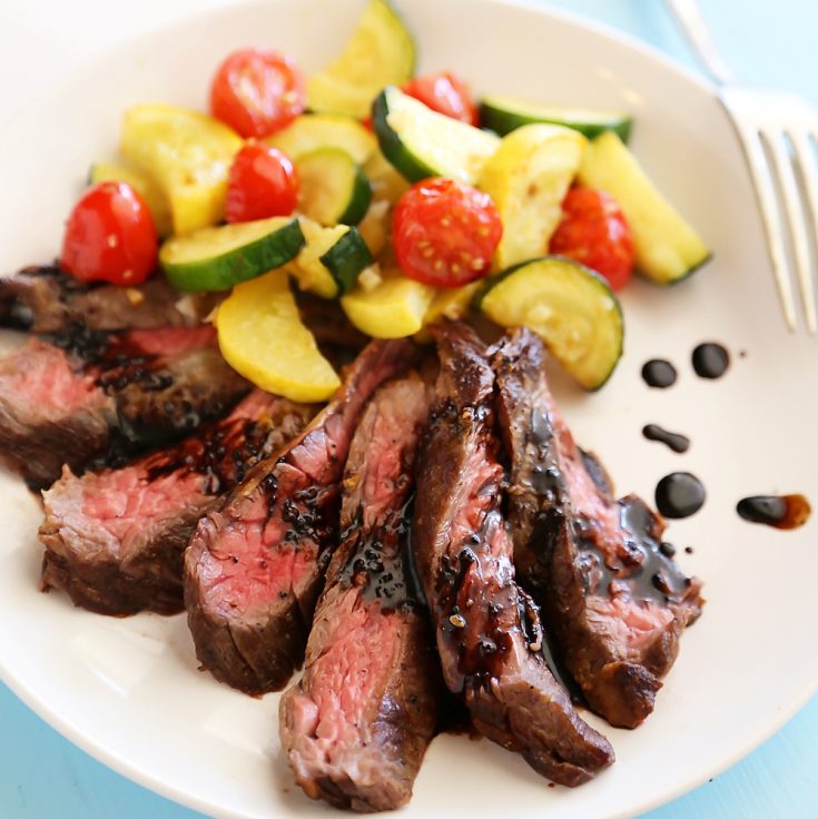 Simply sizzle your zucchini and squash in a large skillet, and toss in your tomatoes and garlic during the last few minutes of cooking. Out come the veggies, and in goes the steak, which only needs 2-3 minutes per side in a piping hot pan for perfect medium rare. Out comes the steak, and in goes your balsamic vinegar and a lil’ sugar, which will bubble up into a syrupy sweet, tangy glaze in minutes. Dee-vine on the steak and veggies both!