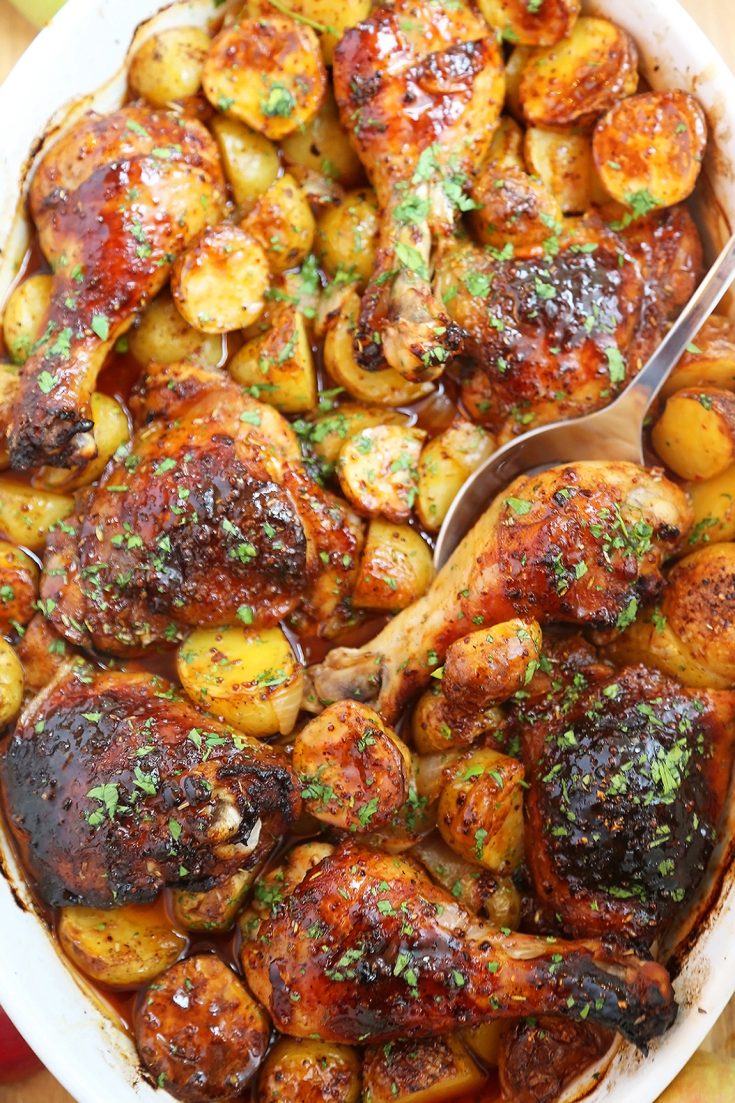 - Remove baking dish from oven. Pour glaze over cooked chicken and potatoes. Garnish with chopped fresh herbs, if desired.
