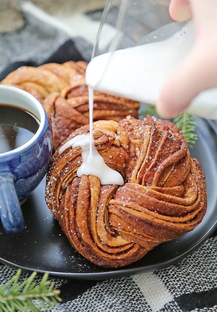 For a special breakfast or brunch, this cozy cinnamon wreath is fun, beautiful and delicious. It bakes up in under 30 minutes, and makes the most comforting start to a slow weekend day. Serve this on holiday mornings and the whole family will love you for it!
