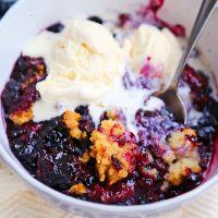 We love how versatile this cobbler is, and how good a hot bowlful is with scoops of cold vanilla ice cream. I can’t wait to create more with fall fruits like apples, pears and apricots. This recipe is easy, family friendly, and the most satisfying treat after dinner. Using fresh summer fruit like blueberries, raspberries, peaches and strawberries, the natural sweetness really pops in every spoonful.