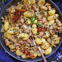 I hope you try this Creamy Tuscan Sausage Gnocchi recipe. Serve it hot with a simple salad, and enjoy it with your family and friends over a glass of wine. This will definitely be a repeat dinner in my home, since even our pickiest kid ate it right up! After trying it once, I bet anything you will agree that it will become a favorite for your family.