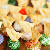 Once you’re finished rolling, just stick a hearty chip or cracker into the top of each. I love the triangular shape of a pita chip for this! Then, pop them into your refrigerator until ready to serve. If you’re making these 1-2 days ahead of serving, just add your chip or cracker closer to the time of serving. You want a crisp, not soggy, chip to balance with this creamy treat!