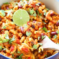 On a cozy night in with my family, these are the comfort food meals I live for! There is nothing like a bowl of this hearty, belly-filling goodness to make your day right, and it is quick enough to cook when you come home from work. It is chock full of vegetables, beans, spices, tomatoes, tender pasta and gooey cheese. Add a handful of fresh cilantro and a squeeze of citrusy lime, and you’ve got an easy vegetarian meal. There’s something in this big bowl for the whole family to enjoy!