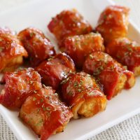 In this case, a savory finger food that will be the hit of every party! These super crispy tater tots are wrapped in a blanket of thick cut applewood smoked bacon (but any good bacon will do). Brushed with a sticky, sweet homemade barbecue sauce, tucked onto a large baking sheet, and baked ’til golden and gooey?