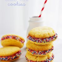 For how fun and festive they look, you wouldn’t believe how easy these cookies are! Just whip up your any flavor of cake mix into a stiff dough, roll it into balls, give them a gentle press to flatten, and bake. Meanwhile, make a homemade frosting with my recipe below, or use a prepared frosting. Pair up the cookies, spread on the frosting, roll the sides in sprinkles, and voila!