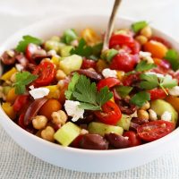Colorful, healthy and full of fresh flavors! This vegetarian Greek salad with chickpeas, olives, feta, tomatoes, onion and garlic is tossed in a light lemon dressing. For extra protein, add grilled chicken or fish, or cooked quinoa.