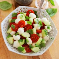 This salad is unbelievably simple, so scrumptious, and works well as either a main dish or side. Or, you could even toss it onto toasted crostini for an elegant appetizer! However you dish it up, you’re gonna love this delicious cucumber caprese with fresh basil… even better with a big glass of white wine to wash it down! (Or at least that’s how I’m picturing it in my preggo-daydreaming. Sigh.)