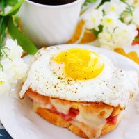 Two thick slices of French bread are slathered on one side with butter. One slice is pan-fried and topped with ham and Swiss (or Gruyère), then topped with the other piece of bread and flipped over to fry for just a few minutes more. Place the sandwich on a plate, smooth on a bit of mayonnaise, and into a 400 degree oven it goes while you fry an egg. Take out the plate – slide the egg on top, and voila! You’ve just created a fancy French breakfast in five minutes. Ooh la la!