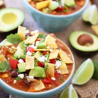 Serve this spicy, citrusy chicken tortilla soup for special occasions, dinner with friends, or as a fun twist on your weeknight meals! Every spoonful has outrageous flavor, and the toppings let you make it yours! Add crunchy baked or fried tortilla strips (recipe included), cilantro, avocado and crumbled queso for a truly amazing soup!