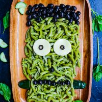 A ghoulishly good Halloween dinner idea! Frankenstein Pasta comes ALIVE! with just 5 ingredients and 20 minutes. Easy to shape on a big platter and let everyone dig in, before trick-or-treating. Can’t find green pasta? Read my quick + easy tip for turning any pasta green!