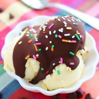 But, back to the good stuff – This homemade chocolate shell is just the coolest. Just like with a Dairy Queen dipped cone (an all-time favorite treat of ours), the sauce goes on smooth and hardens in seconds. To give it a little “push”, put it in the fridge or freezer to firm it up even faster. What results is sheer magic – a hard, chocolatey shell surrounding your scrumptious dessert!
