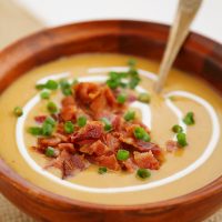 There is truly nothing better on a chilly night than a bowl of this soup to warm up to. It’s so simple to make, and lusciously creamy with the additional of fat-free milk (or any milk you choose). No need for fatty heavy cream or half-and-half. Save the naughty goodness for the crispy, salty chopped bacon on top!