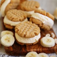 I can hardly believe I haven’t shared my favorite peanut butter cookie recipe with you until now. So, I thought that I would not only share that melt-in-your-mouth cookie, but a fun way to really amp up the flavor. Enter my all-time favorite light ice cream swirled with fresh banana bits and sandwiched between two peanut butter cookies.