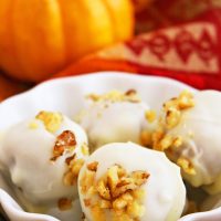 You may have seen and tasted plenty of variations of cake truffles, but you’ve never had them like this. The rich, moist pumpkin cake that goes together quickly is swirled with candy coating, covered in chopped walnuts and, just like that, they’re all devoured before you know it!