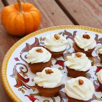 They are super simple to whip up, too! Just take a bunch of ingredients you probably already have, toss in some pumpkin puree and chopped walnuts, and bake those beauties for 15 minutes. The aroma is rich, spicy and absolutely scrumptious, and the frosted cupcakes are just little bites of heaven on earth. I know you’ll agree, and hopefully get a taste of what I love so much about the fall season!