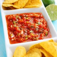 On tacos or tortilla chips, it doesn’t get better than this super easy homemade salsa! Just like your favorite restaurant style, but even more zesty and flavorful!