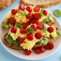 Hearty, healthy and full of fresh flavors! This caprese avocado toast with buttery scrambled eggs makes a scrumptious snack, breakfast, lunch or even dinner. Serve it on toasted baguette slices for an easy, elegant brunch bite.