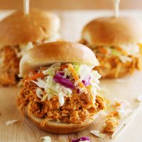 When the chicken is tender and cooked through, remove it and shred with two forks. Add it back to your slow cooker, stir it around the sauce, and spoon it out on top of slider buns, lettuce leaves, or however you choose to serve. It is SO deliciously tangy and perfect for parties.