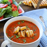 This hearty, healthy tomato basil soup is easily made in under an hour. Both kids and adults will rave for this one! Top with crispy, gooey grilled cheese croutons and serve with a green salad for a delicious weeknight dinner.