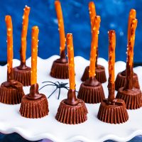 These bewitching little broomsticks are only 3 ingredients – dark chocolate chips, dark chocolate mini peanut butter cups, and pretzel sticks – that’s it! If you have 10 minutes, then you have time to make these crunchy, creamy and oh-so addictive Witches Broomsticks.