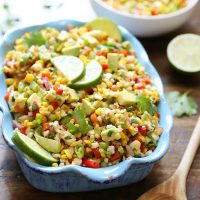 In a large skillet set to high heat, add olive oil. Stir in corn and cook for 5-6 minutes, or until the corn begins to char slightly. Alternately, you can place the corn in an ovensafe dish under your oven broiler and stir every 4 minutes, until corn is charred through. Pour corn into a large bowl. Let cool for 10 minutes.