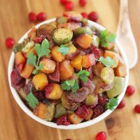 Roasted Butternut Squash and Brussels Sprouts with Cranberries, Apples and Onions