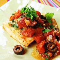 Add wine, tomatoes, olives, half the parsley, and red pepper flakes to the pan with the fish. Season to taste with salt and bring to a simmer over medium heat. Reduce heat to medium-low and simmer, partially covered, until fish is just cooked through, 10–15 minutes, spooning sauce over fish as it cooks. Uncover and simmer until sauce has thickened slightly, about 3 minutes. Adjust seasonings and sprinkle with remaining parsley.