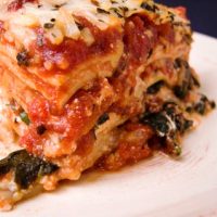Drain beef, return to skillet. Stir in pasta sauce. Spread 1 cup of the sauce onto the bottom of the prepared baking dish. Top with layers of lasagna noodles, one-third of the ricotta cheese mixture, and 1 cup of the sauce. Repeat layers twice. Top with remaining 3 noodles and the remaining meat sauce. Sprinkle with remaining 1-1/4 cups mozzarella cheese and ¼ cup parmesan. Spray one side of aluminum foil with cooking spray (to avoid cheese sticking) and lightly cover dish.