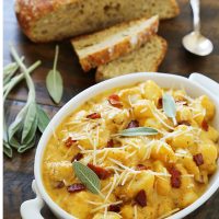 In a large skillet set to medium heat, add chopped bacon and fry until just crisp. Add sage and garlic. Sauté for 1 minute.
