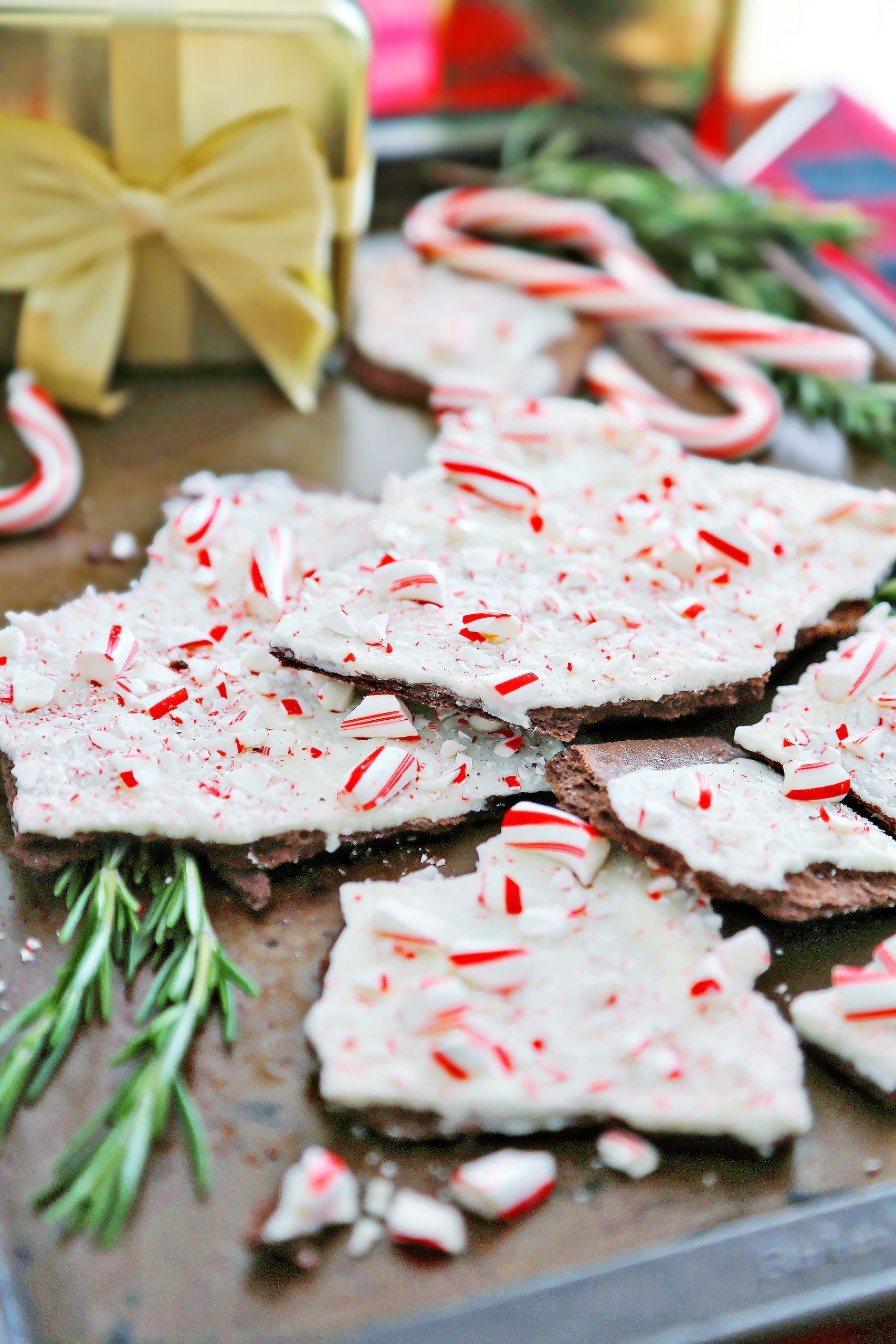 - Spoon melted chocolate all over chocolate graham crackers. Sprinkle crushed candy canes on top.